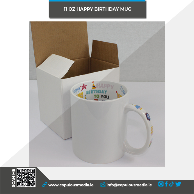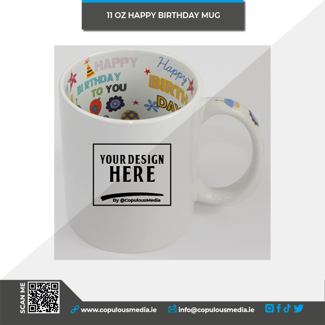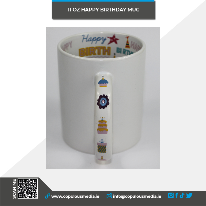 - Our beautiful new mugs with the inside printed with an elaborate well decorated “Happy Birthday”. With a printed handle!